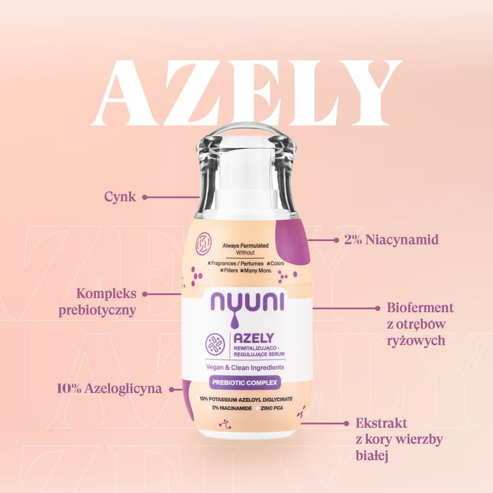 Serum AZELY zostało stworzone dla osób zmagających się z niedoskonałościami, trądzikiem, nadprodukcją sebum oraz przebarwieniami potrądzikowymi. Idealnie sprawdzi się u skóry tłustej, mieszanej, trądzikowej i wrażliwej, która potrzebuje równowagi, ukojenia i matowego wykończenia bez podrażnień.
